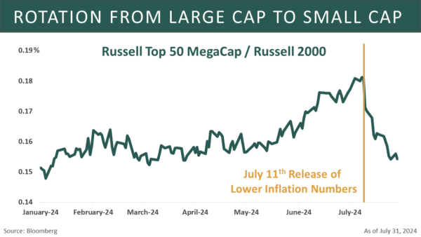 In July, the stock market experienced a significant shift in leadership, with a notable rotation away from the previously dominant Technology sector. This change was particularly evident as previously lagging cyclical sectors gained momentum, most strikingly manifested in a sharp rally of small-cap stocks.
