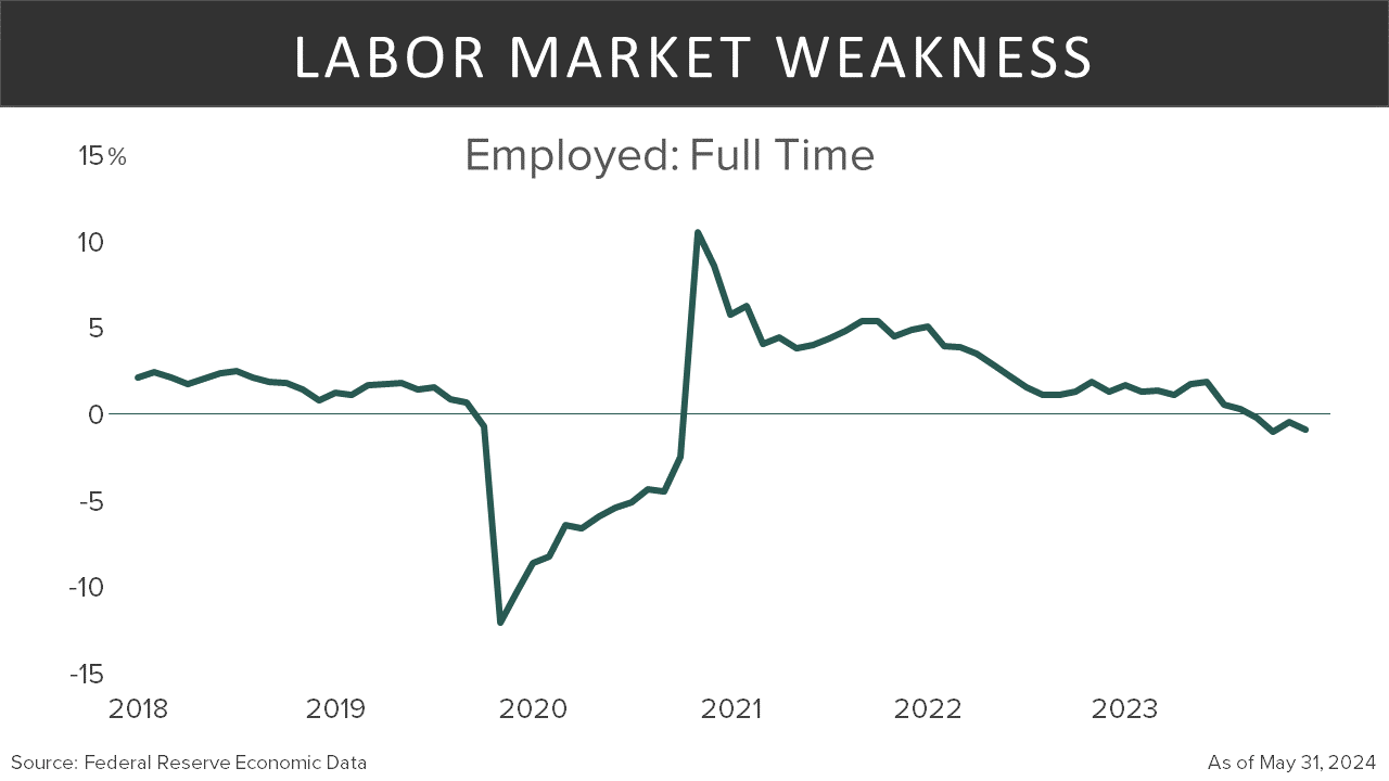 However, the household survey revealed contrasting data, showing a significant contraction and an increase in the unemployment rate to 4.0%. This discrepancy might be attributed to the birth-death model used by the Bureau of Labor Statistics, which may not accurately capture current economic conditions. The household survey also indicated a decline in full-time jobs, an increase in the median duration of unemployment, and a shrinking labor force, with over 400,000 people leaving the workforce in May.